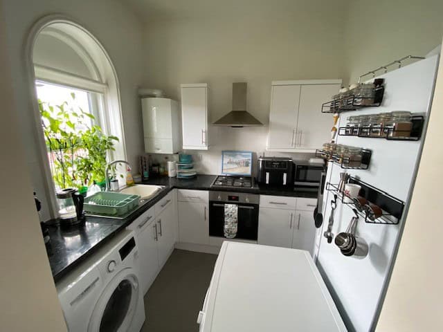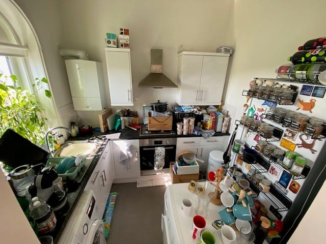 We cleared the worktops first and removed all the trip hazards. We took out everything from one cupboard at a time and sorted it into piles of stuff to keep, to recycle, take to the food bank or throw away such as out of date food.